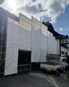 工事に伴い、玄関正面に足場を設置しております。