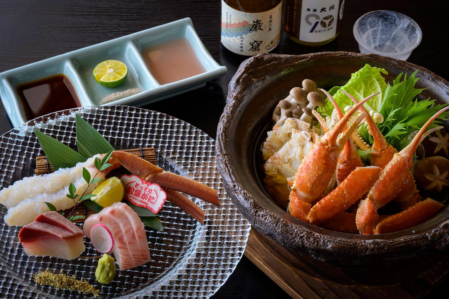 松葉蟹を贅沢にお一人様につき二杯、全て「活蟹」にてご用意する、大橋が誇る至福の蟹尽くし会席